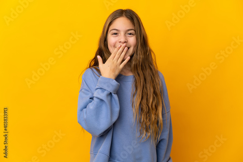 Child over isolated yellow background happy and smiling covering mouth with hand