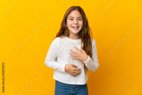 Child over isolated yellow background smiling a lot