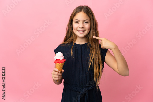 Child with a cornet ice cream over isolated pink background giving a thumbs up gesture