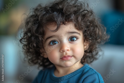 Child with curly hair and big expressive eyes gazes curiously in a cozy indoor setting during daylight