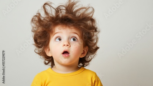 Child with curly hair looks surprised while wearing a yellow shirt against a light background