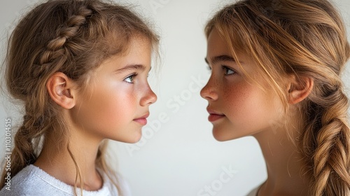 Children's portrait showcasing two girls with braided hair facing each other, highlighting innocence and curiosity against a plain background.