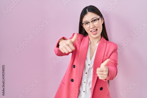 Chinese business young woman wearing glasses approving doing positive gesture with hand, thumbs up smiling and happy for success. winner gesture.