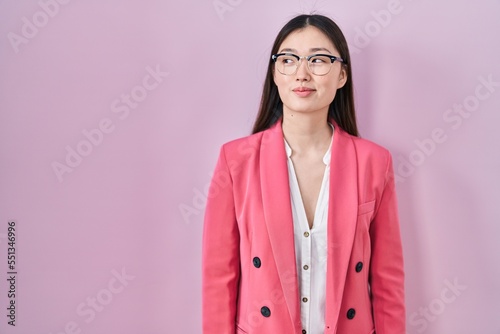 Chinese business young woman wearing glasses smiling looking to the side and staring away thinking.