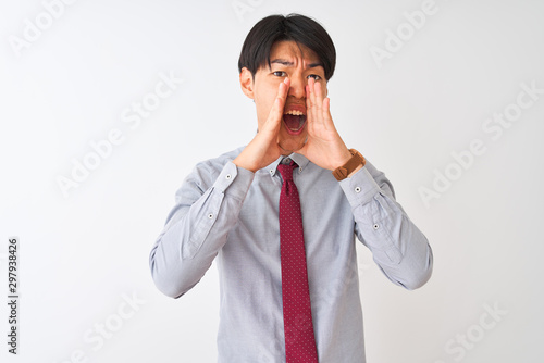 Chinese businessman wearing elegant tie standing over isolated white background Shouting angry out loud with hands over mouth