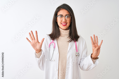 Chinese doctor woman wearing coat and pink stethoscope over isolated white background showing and pointing up with fingers number nine while smiling confident and happy.