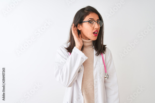 Chinese doctor woman wearing coat and pink stethoscope over isolated white background smiling with hand over ear listening an hearing to rumor or gossip. Deafness concept.