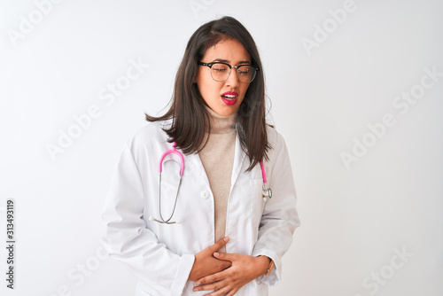 Chinese doctor woman wearing coat and pink stethoscope over isolated white background with hand on stomach because indigestion, painful illness feeling unwell. Ache concept.