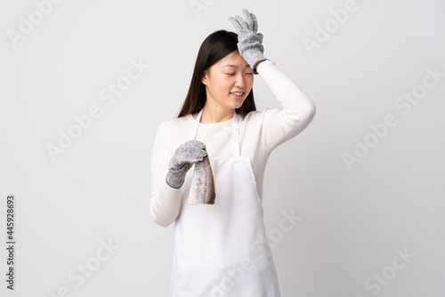 Chinese fishmonger wearing an apron and holding a raw fish over isolated white background has realized something and intending the solution