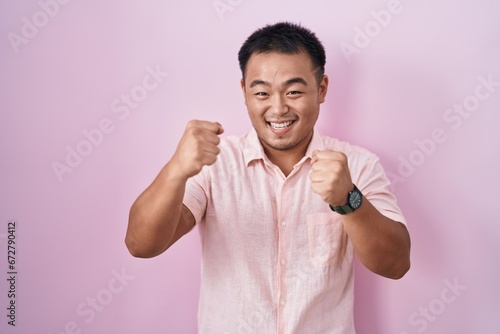 Chinese young man standing over pink background very happy and excited doing winner gesture with arms raised, smiling and screaming for success. celebration concept.