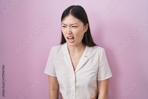 Chinese young woman standing over pink background angry and mad screaming frustrated and furious, shouting with anger. rage and aggressive concept.