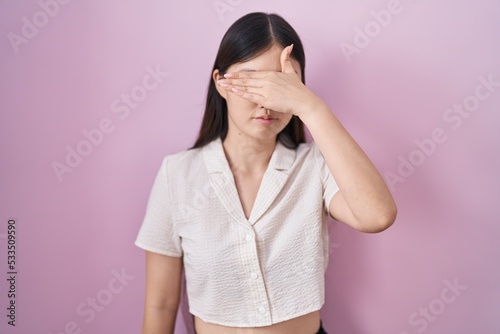 Chinese young woman standing over pink background covering eyes with hand, looking serious and sad. sightless, hiding and rejection concept