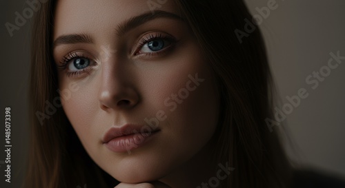 Cinematic Close Up of a Beautiful Woman with Subtle Makeup and Striking Blue Eyes In Contemplation Against a Seamless Gray Backdrop Beauty Cosmetic and Skincare Concept