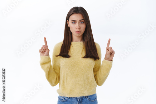 Clingy and cute whining brunette girlfriend making silly sad grimace as begging to buy something, pointing fingers up look camera jealous and gloomy, sulking over white background