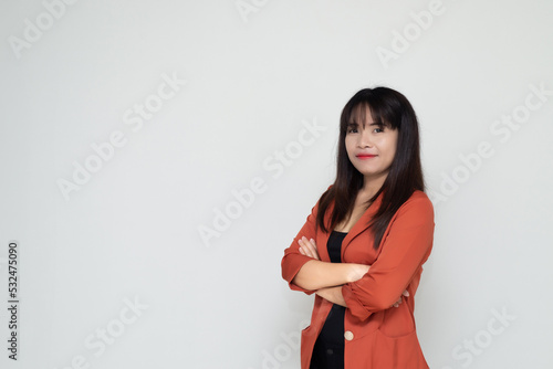 close up attractive adult business woman asian girl with happy and smile against white concrete wall office with concrete background and blank copy space.