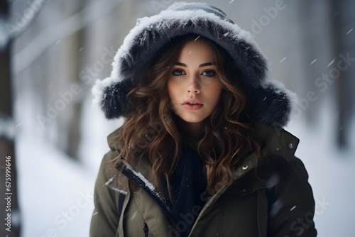Close up Beautiful woman in a stylish winter coat and snow cap, walking through a snowy forest.