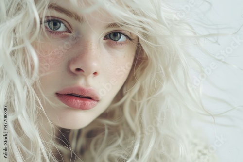 Close up beauty portrait of albino girl showing curly white hair, freckles and green eyes