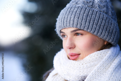Close up beauty portrait of beautiful girl, pretty attractive woman in warm clothes knitted hat and white scarf is walking in winter snowy park at cold snow frosty day looking into distance. North
