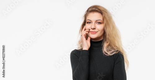 Close up blonde girl looking cute, adorable and happy, smiling romantically with hands next to face. Place for ad