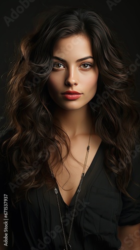 Close up horizontal front portrait of attractive young indian woman with serious expression on face. Woman portrait illustration. Generative AI