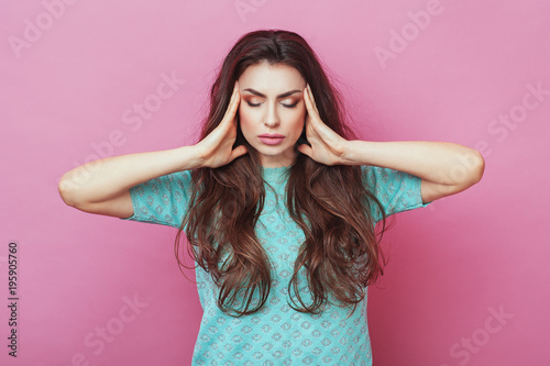 Close up isolated portrait of young stressed angry woman holding hands on head. Negative human emotions, headache face expressions. Lifestyle Fashion Beauty People Business concepts.