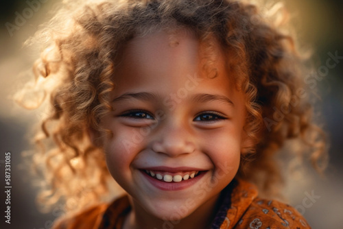 Close up of a beautiful little girl with curly hair posing smiling in backlight - Ai generative
