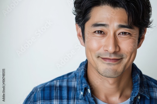 Close up of a smiling middle aged Asian man in a blue plaid shirt against a white backdrop