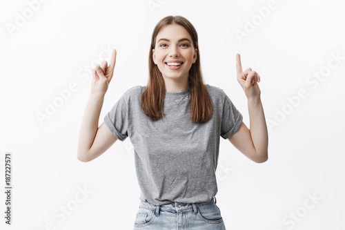 Close up of cheerful young good-looking european young woman with dark hair in casual grey clothes smiling, looking in camera with relaxed and happy face expression, pointing upside with both hands