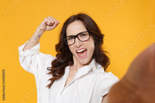 Close up of excited young business woman in white shirt glasses isolated on yellow wall background. Achievement career wealth business concept. Doing selfie shot on mobile phone doing winner gesture.