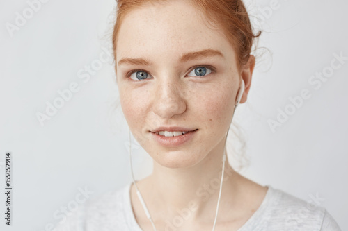 Close up of redhead girl in headphones smiling looking at camera.