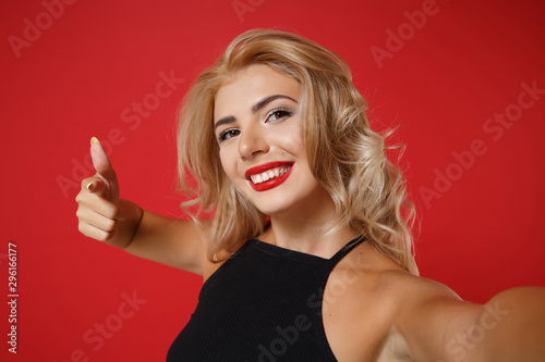 Close up of smiling young woman girl in black clothes posing isolated on red background. People lifestyle concept. Mock up copy space. Doing selfie shot on mobile phone, point index finger on camera.