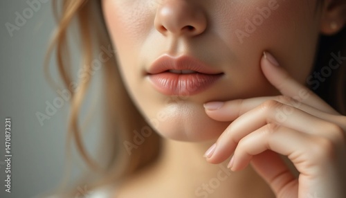 Close up of Woman s Face Soft Skin Natural Makeup Pink Lips Hand on Cheek
