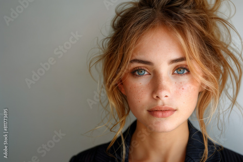 Close up of young woman with striking blue eyes in business suit against light grey blank background