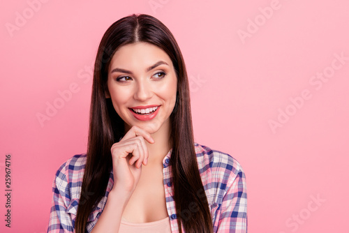 Close up photo amazing beautiful her she lady brown eyes look empty space long straight hair wondered hand arm chin wear casual checkered plaid shirt clothes outfit isolated pink bright background