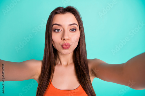 Close up photo beautiful amazing her she lady coquette make take selfies tell speak say skype send kiss friends relatives parents wear casual orange tank-top isolated bright teal turquoise background