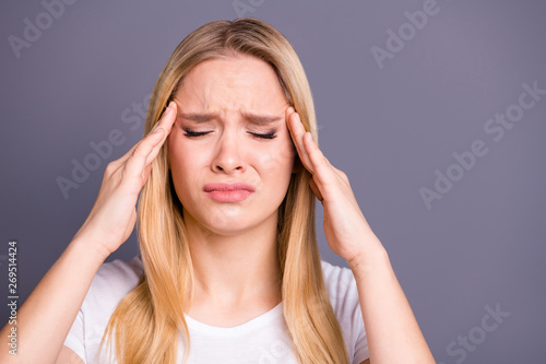 Close up photo beautiful amazing her she lady suffering facial expression eyes closed hold hands arms temples terrible pain disease wear casual white t-shirt isolated dark grey background