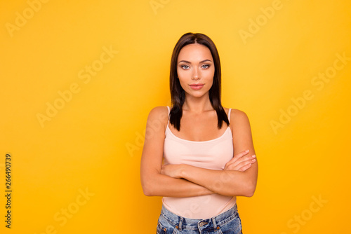 Close up photo beautiful amazing she her lady kindhearted easy-going overjoyed arms crossed self-confidence wear casual pastel tank-top outfit clothes isolated yellow bright vibrant vivid background