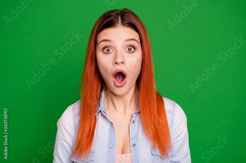 Close up photo beautiful amazing she her lady open mouth not believe eyes full fear oh no expression epic fail loser lose lost wear casual jeans denim shirt isolated green bright background