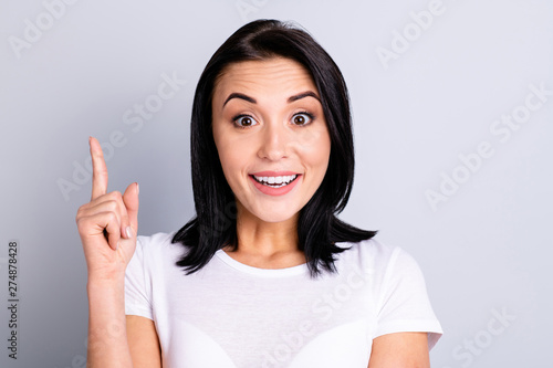 Close up photo beautiful amazing she her lady perfect ideal appearance hand arm index finger directing news up empty space tips low prices wear casual white t-shirt isolated bright grey background