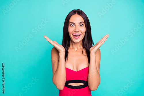 Close up photo beautiful amazing she her lady raised arms palms air open mouth achievement low prices black friday shopping addicted formal-wear red dress isolated teal turquoise bright background