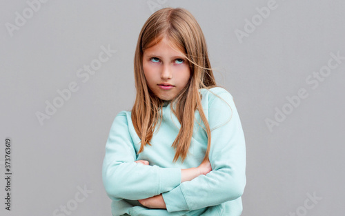 Close up photo beautiful her she lady impolite facial expression do not want listen morals teaching mother mom parents roll eyes up empty space isolated on gray background