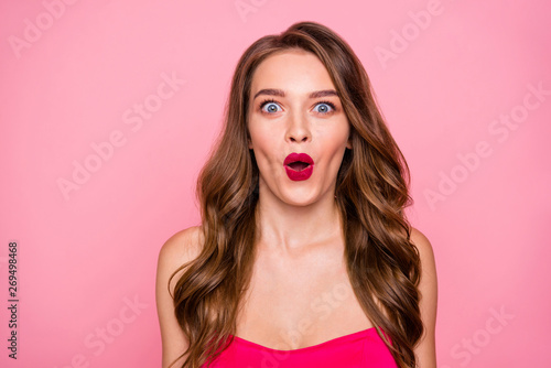 Close up photo beautiful she her lady unexpected free shopping black friday low little prices open o shape mouth wear cute shiny colorful formal-wear dress isolated pink rose bright vivid background