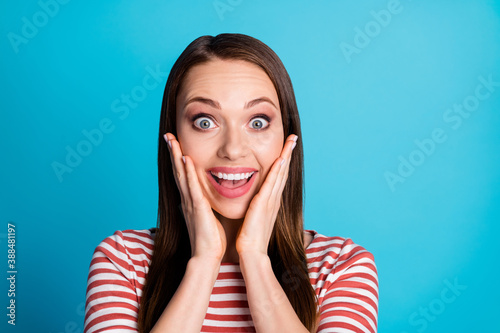 Close up photo of astonished crazy girl impressed incredible sales discount novelty touch hands face wear casual style clothes isolated over blue color background