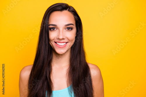 Close up photo of charming cute cheerful lady standing confidently in front of camera isolated over yellow vivid color background