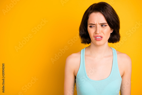 Close up photo of depressed disgusted girl looking at something terrible disdainfully while isolated with yellow background