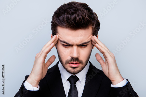 Close up photo of sad man in black suit touching his temples because of suffering from migraine