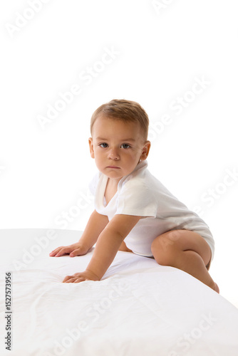 Close up photo of toddler boy in crawling pose, staring ahead seriously with hands on bed against white studio background. Concept of growth, childhood, determination, movement, readiness.