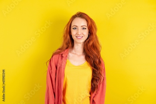 Close up photo of young beautiful red haired woman over yellow studio background toothy smiling
