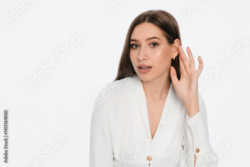 Close up photo of young pretty curious nosy woman lady touch ear doing eavesdropping look novelty, try to hear you overhear listening intently hot news isolated on white color background