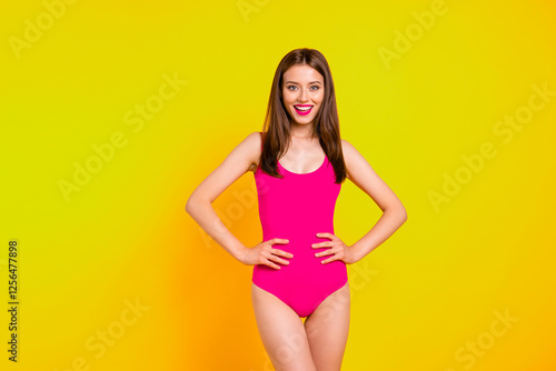Close up photo portrait of stylish style trendy sexual beautiful attractive with toothy beaming smile gorgeous joyful cheerful arrogant girlish lady lifeguard in tight outfit isolated vivid background